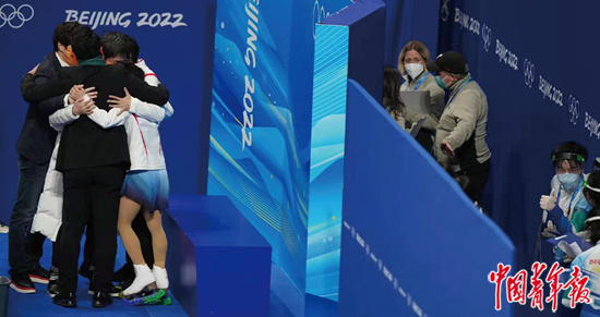 比赛结束,中国花滑队双人滑主教练赵宏博和中国花滑协会主席申雪,走到冰上,与隋韩二人相拥合影。