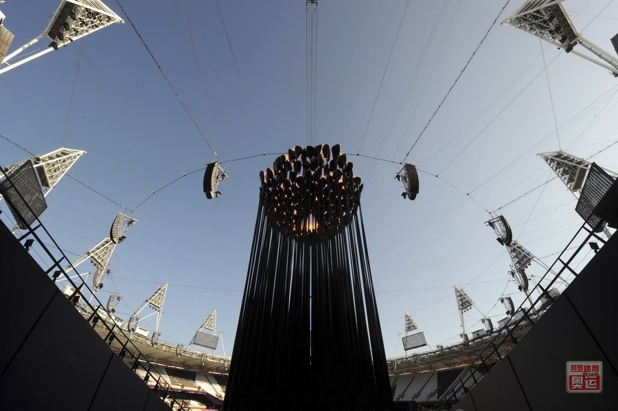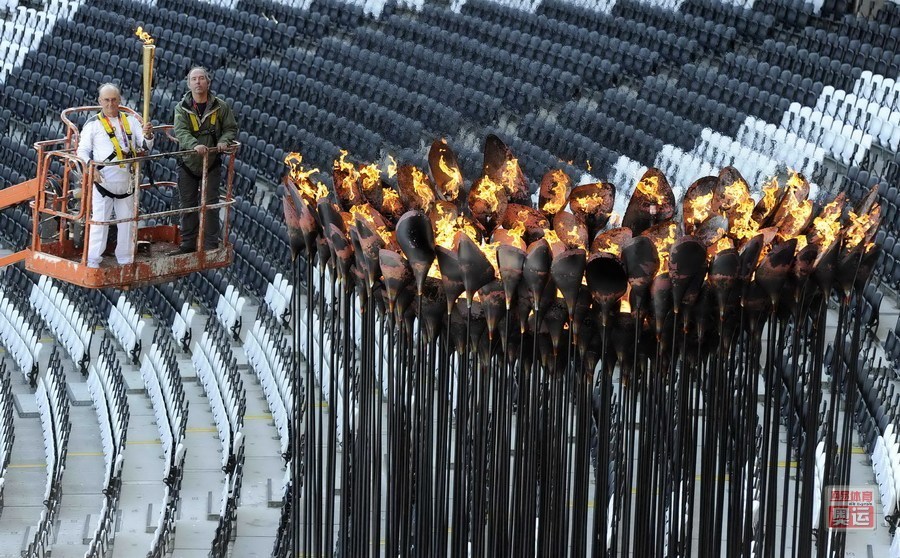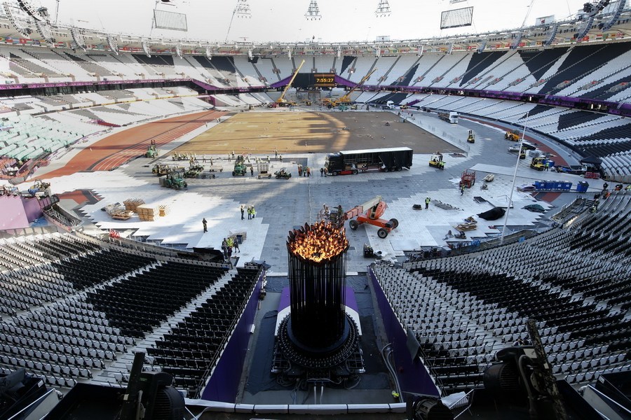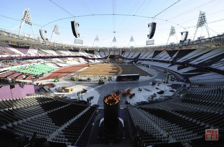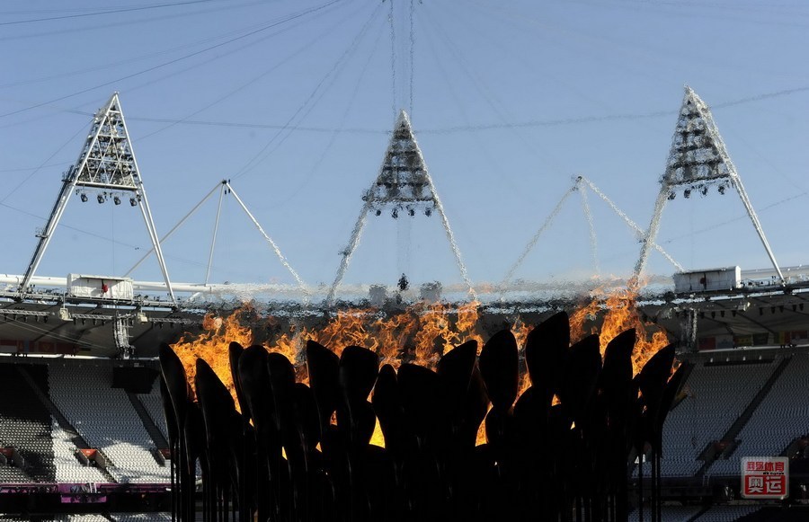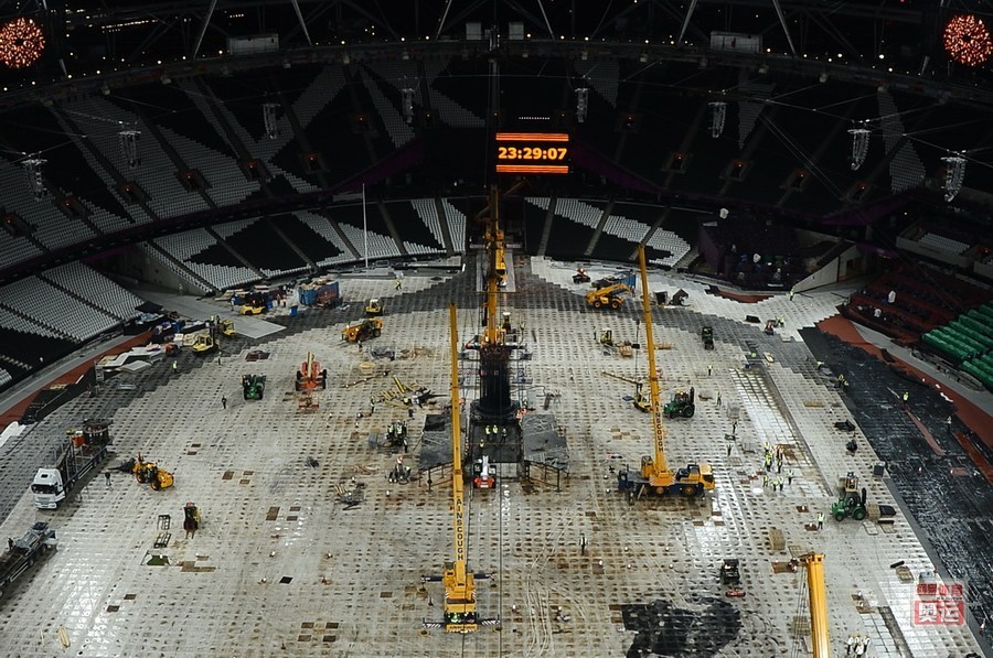 2012年7月30日,英国伦敦,伦敦奥运会的主火炬在刚刚过去的夜晚进行了一次小搬家,圣火也被暂时熄灭,为了迎接比赛,火炬台由伦敦碗的中心移动到体育场的南部,并在太阳升起之时重新点燃。