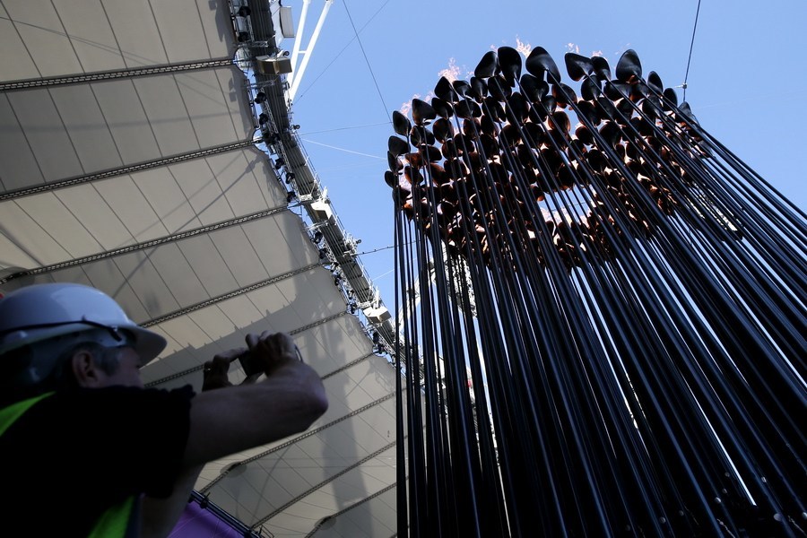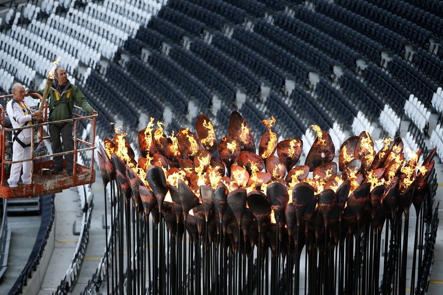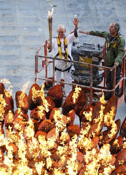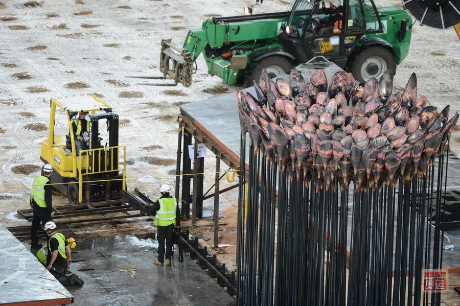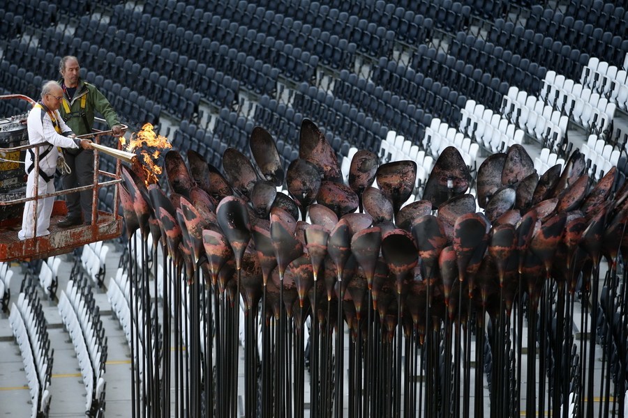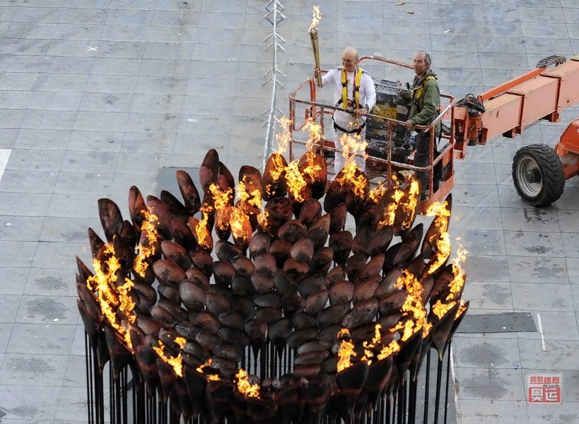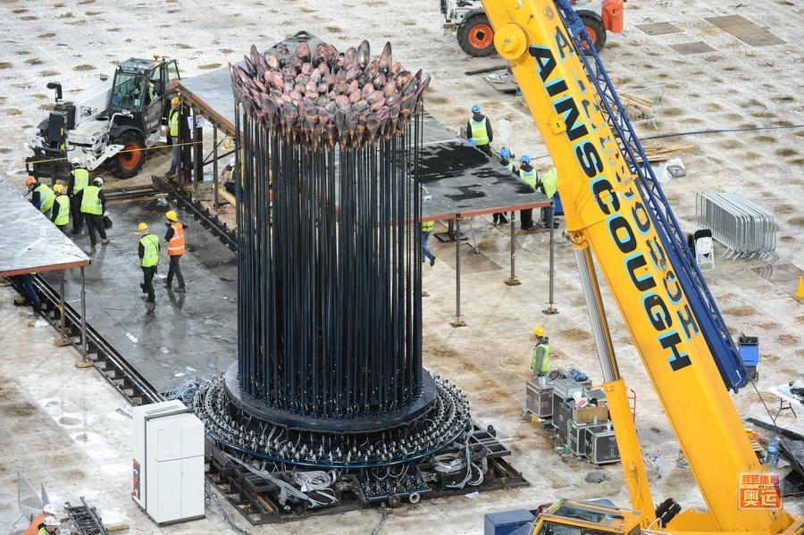 2012年7月30日,英国伦敦,伦敦奥运会的主火炬在刚刚过去的夜晚进行了一次小搬家,圣火也被暂时熄灭,为了迎接比赛,火炬台由伦敦碗的中心移动到体育场的南部,并在太阳升起之时重新点燃。