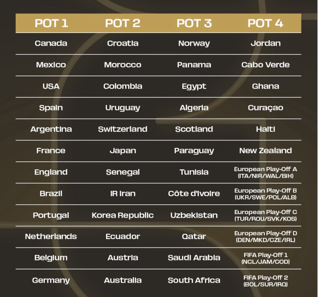北京时间11月26日,国际足联公布了2026年美加墨世界杯参赛球队分档,东道主加拿大、墨西哥和美国直接进入第一档,其余39支已晋级球队根据2025年11月19日发布的国际足联男子世界排名分为四个档次(每档12支球队)。另外,2个国际足联附加赛待定席位及4个欧洲区附加赛待定席位将被归入第四档。